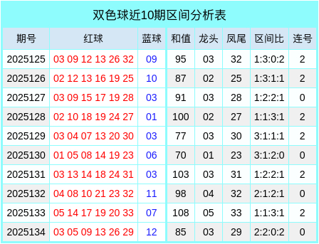 和值分析:上期红球奖号和值85,在近10期的数据中裸露平均值为91.40,其中5期高于平均值,上期和值低于平均值。瞻望本期和值将会开在平均值之上,参考和值将会开在97足下。