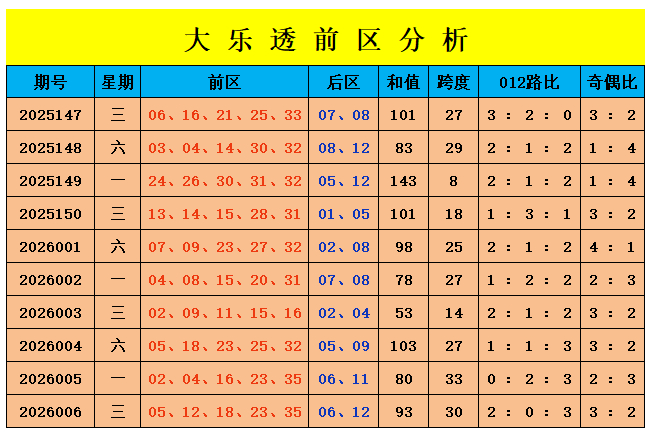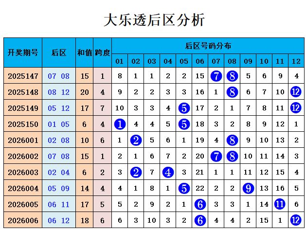 上期总结:大乐透第2026006期奖号为:前区05、12、18、23、35,后区06、12,前区奖号012路比为2:0:3,奇偶比为3:2,后区开出0路、0路组合06、12